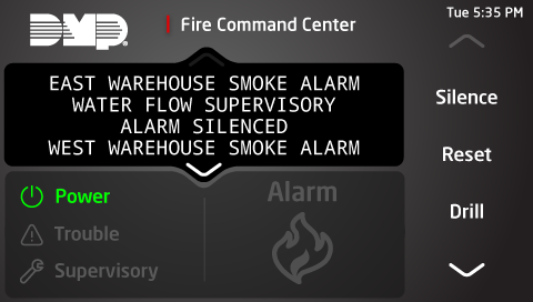 DRILL Key - Press the DRILL key to display SURE? YES NO. Press the select key under YES to begin the fire drill, which sounds the main bell and activates the Fire Bell Output. Press the select key under NO to return to the status list. Press SILENCE or enter a user code to silence the alarm bells and end the fire drill.